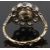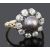 the central natural black pearl in a closed setting and set within a circular border of open backed set old cut diamonds. the yellow metal mount with fin scroll detail, accompanied by G.C.S Pearl Report stating that the pearl is a natural salt water black pearl.