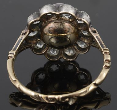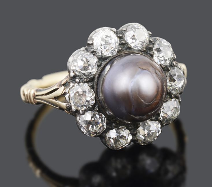 An unusual large late Georgian natural black pearl and diamond set cluster ring
