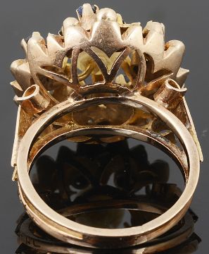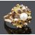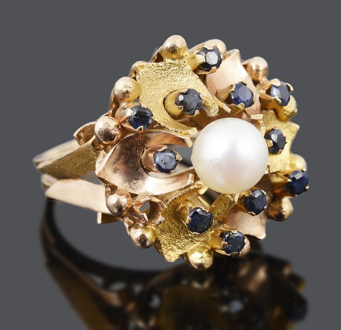having central cultured pearl within sapphire set yellow and rose metal petals with textured detail and scroll detailed shoulders, mount tests for gold.