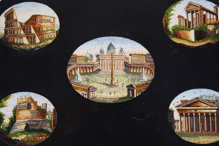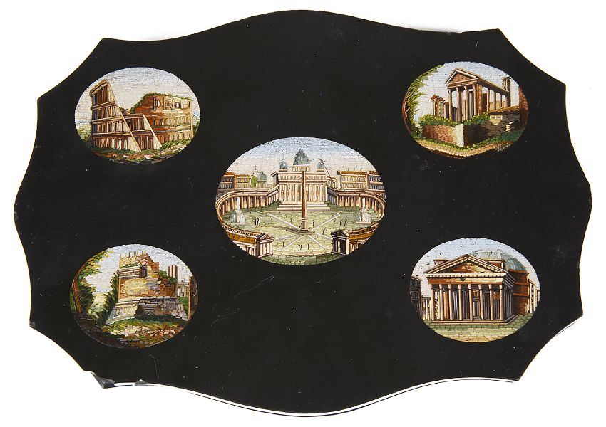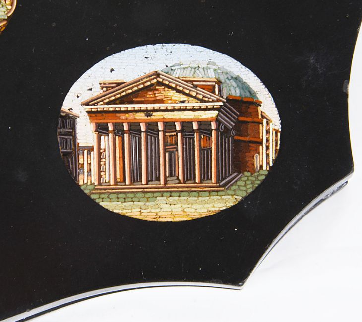 the panel inlaid with five fine micro mosaic architectural panels including St Peter's Square, The Colosseum, The Pantheon, The Temple of Portunus and the Tomb of Caecilia Metella.
