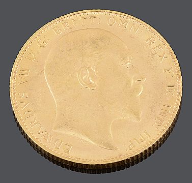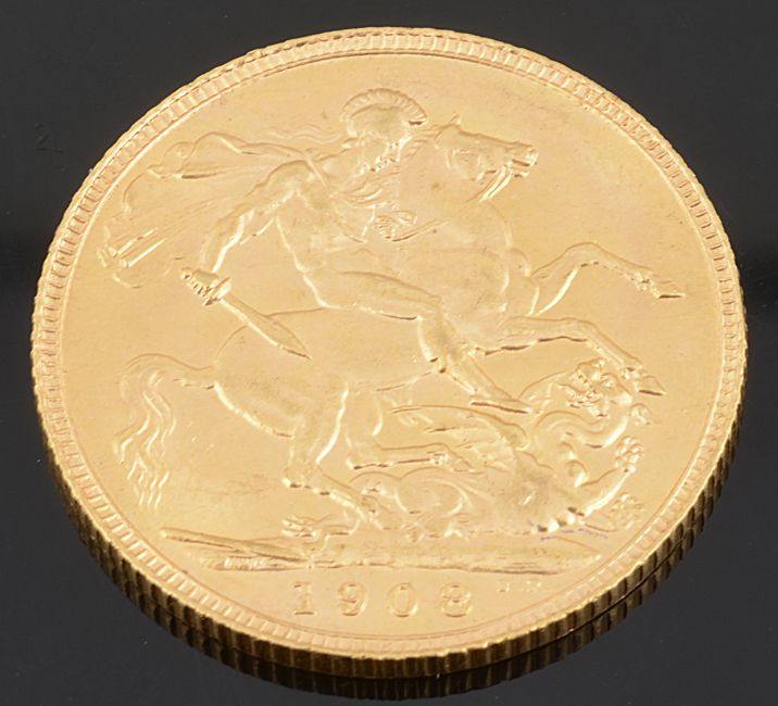 gold coin 0.916, Obverse: Obverse: uncrowned portrait of King Edward VII right, legend round EDWARD VII D:G BRITT: OWN: REX F:D: IND: IMP; Reverse: St George slaying the dragon right, date in exergue 1908.