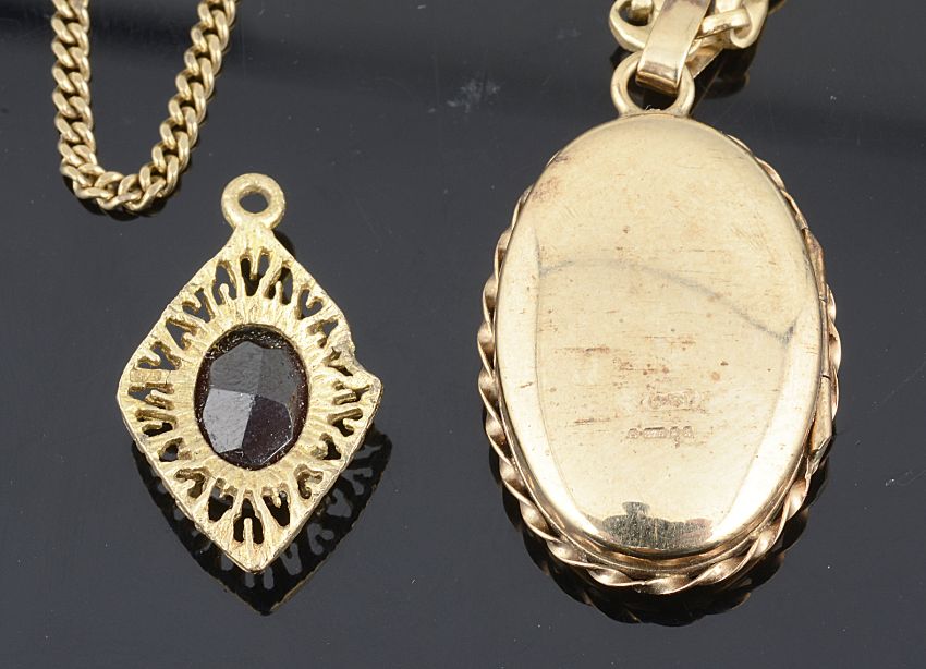 the hinged oval picture locket with engraved scroll decoration and suspended from a 9ct gold cable link chain, together with a small 9ct gold mounted garnet pendant on 9ct god chain, (2).