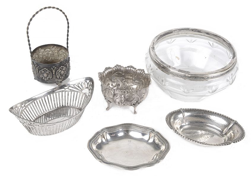 comprising a Dutch pierced navette shaped bonbon dish, bonboniere decorated with winged cherub masks, a pin dish with piecrust rim, a planished oval pin dish, an embossed silver frame with carrying handle lacking liner, and a silver mounted cut glass bowl, (6).