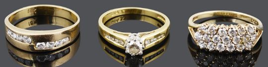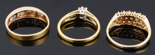 the single stone diamond set between channel set diamond shoulders, mount marked for 18ct gold, together with a Continental 18K channel set diamond dress ring and a 14ct gold mounted white sapphire set dress ring, (3).