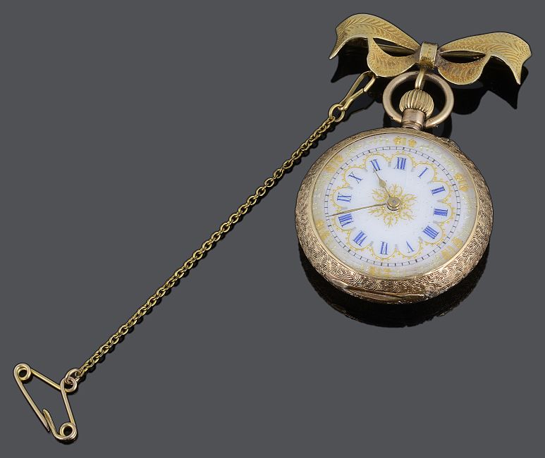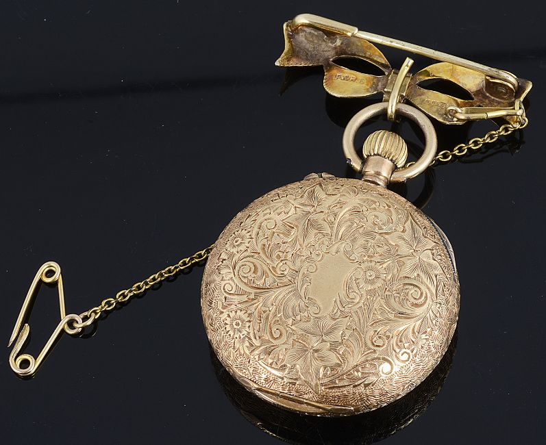 the white enamel dial with gold hands, blue Roman numerals, minute track and gilt decoration, the case with all over foliate engraved decoration, top wind movement, gilt metal dust cover, the case marked 14K and numbered 125878, together with 9ct gold ribbon brooch with suspension hook (2)