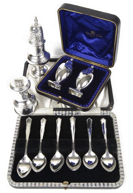 a suite of six silver teaspoons, hallmarked Sheffield 1967 by James Dixon & Sons Ltd; a cased pair of Victorian silver pepperettes, hallmarked London 1897 by Josiah Williams & Co.; a George III silver sifter, with pierced hatche domed top, baluster body with circular foot ring, hallmarked London 1771 possibly by Thomas Shepherd; a silver pepper grinder, hallmarked Sheffield 1962 by James Dixon & Sons Ltd, (qty).