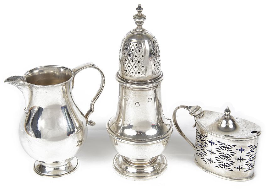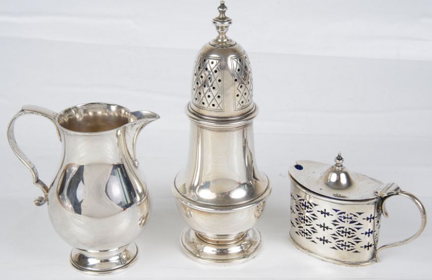 the knopped finial above a pierced domed lid, upon a baluster shaped body with circular foot ring; together with a contemporary silver cream jug, hallmarked London 1970 by Wakley & Wheeler, with s-scroll handle sparrow beak, baluster body on a circular foot ring and a Victorian silver pierced lidded mustard condiment, hallmarked Birmingham 1900 by Deakin & Francis Ltd, with blue glass liner and silver spoon, (3).