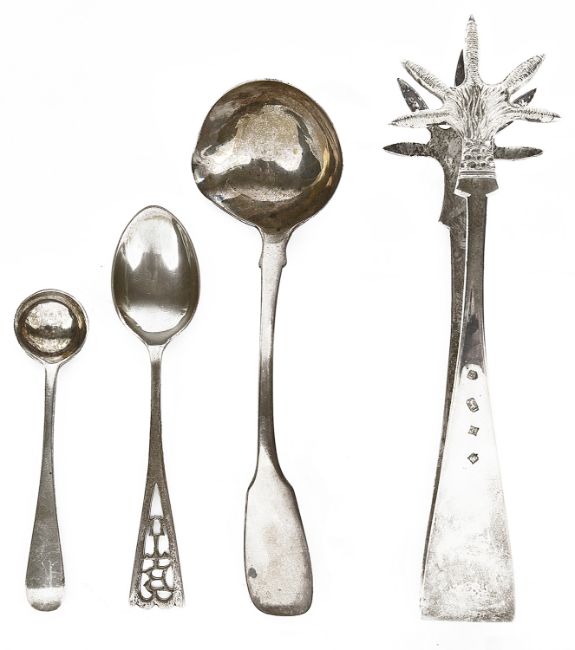of typical form with claw tongs and a George III Irish silver sauce ladle, hallmarked Dublin 1810 possibly by James Brady, a Victorian silver condiment spoons, hallmarked London 1887 by John Aldwinckle & Thomas Slater and a pierced handled teaspoon, hallmarked Birmingham 1981 by Roberts & Dore, (4).