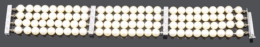the four rows of even sized pearls spaced with three diamond set, white metal square section bars, the third bar being the invisible push action fastening clasp, white metal tests for gold