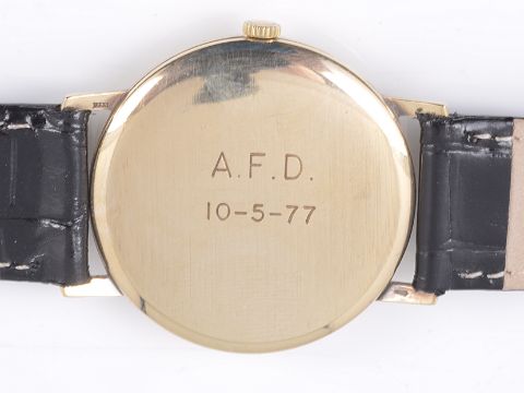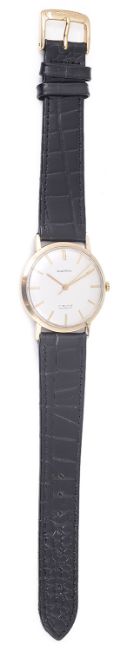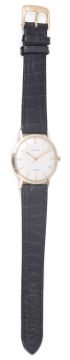 the circular dial with baton hours and hands, in a circular case with black leather strap, case back number: 2603, case hallmarked 9ct.