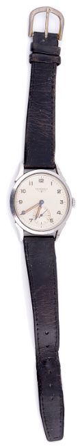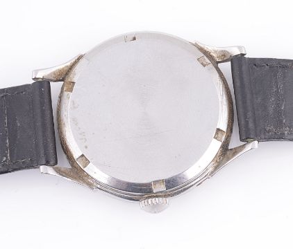 the circular dial with Arabic hours, dauphine hands, subsidiary seconds dial, in a stainless steel case, movement number: 9358651 12.68z, case number: 6442-1 901, with leather strap.