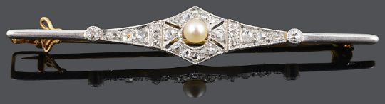 A delicate Edwardian cultured pearl and diamond set bar brooch