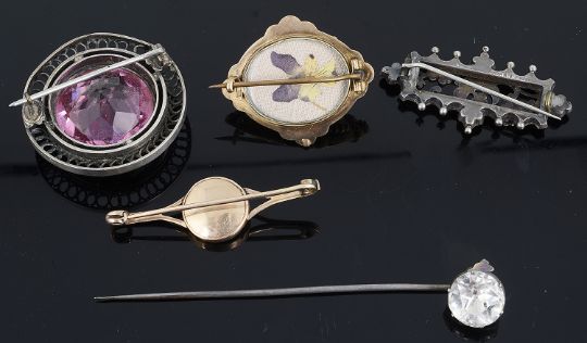 the circular blue enamel disc having central seed pearl in a raised setting within c scroll border on a bifurcated band, together with a Victorian yellow metal Etruscan embossed brooch having granulated decoration and with locket back, test for gold, a late Victorian silver and yellow metal crescent and clover brooch, a paste set silver stick pin and a silver mounted pink paste brooch (5)