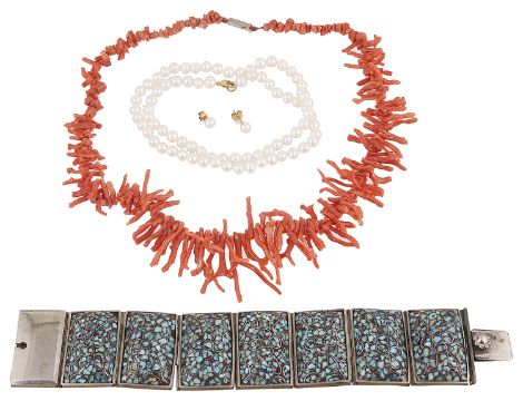 cultured pearl necklace approx. 47 cm., coral necklace approx. 47 cm., bracelet approx. 19 x 3.5 cm.