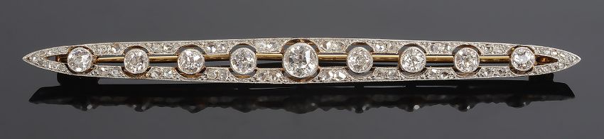 having central collet set diamond approximately 0.40 carat and a further four smaller diamonds to either side, the stones set in rose diamond set shaped brooch mount, tests for gold.