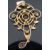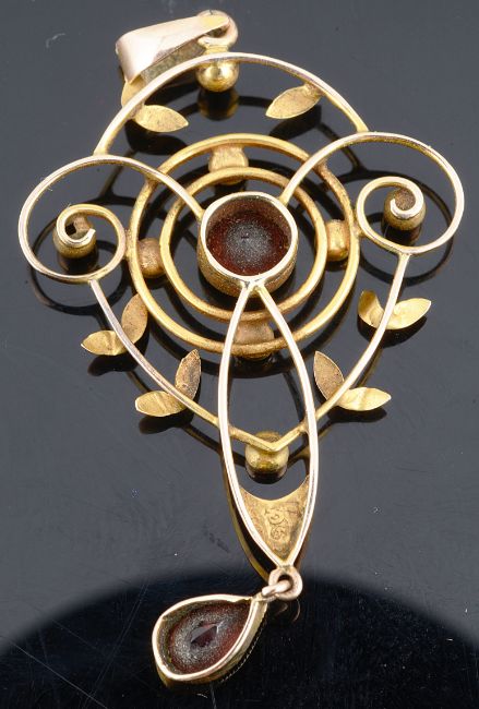 having central garnet within seed pearl and foliate pierced mount and with garnet drop below, two colour gold mount stamped 9ct to reverse.