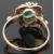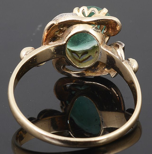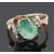 having central oval twist set emerald between plain and diamond set scrolls, mount tests for gold.