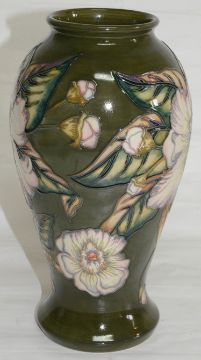 of baluster form with tubelined flower heads on a green base, impressed factory marks to base.