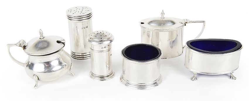 including a Victorian silver cylindrical pepperette, hallmarked London 1894 by Horace Woodward & Co. Ltd; a George V silver pepperette and salt, hallmarked Birmingham 1924 by Docker & Burn Ltd with blue glass liners; a silver lidded mustard with associated clear glass liner, hallmarked Birmingham; an Edwardian silver salt with blue glass liner, hallmarked Sheffield 1910 by Walker & Hall; a George V silver lidded mustard with blue glass liner, hallmarked Birmingham 1925 by William Adams Ltd, (6).
