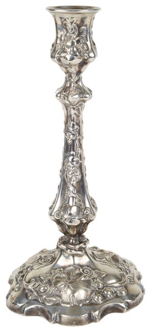 the candleholder and knopped stem embossed with trailing foliage, raised upon a shaped embossed base.