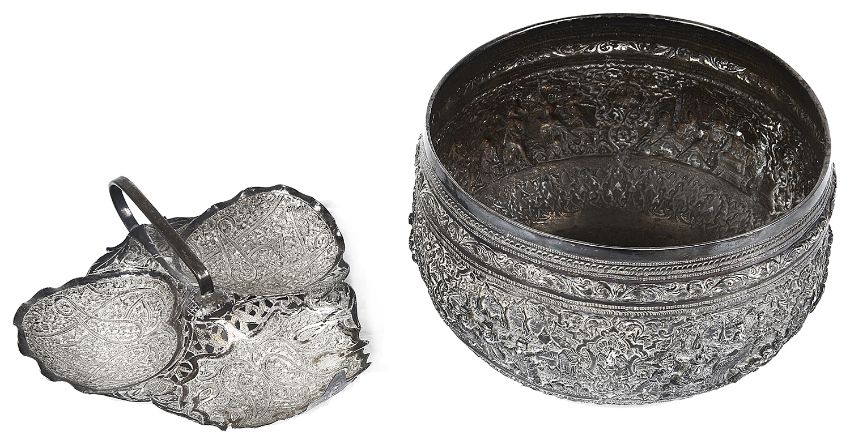 of circular form decorated with bands of repousse, chased and engraved scenes illustrating a continuous story with figures dancing and seated; together with a similar white metal trefoil pierced dish with handle, (2).