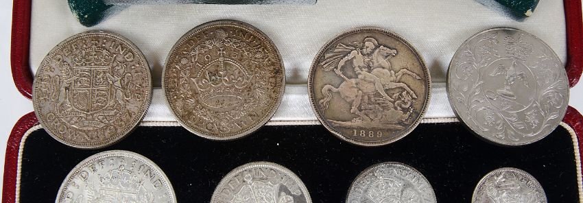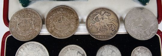in a fitted case, Crown to Maundy penny, missing the 3 pence and has a extra 1901 1 pence coin in the fitted case; together two 1951 Festival of Britain five shillings, boxed; 1889 Victoria crown; 1931 George V crown; 1931 George V crown; 1977 Elizabeth II crown, (qty).