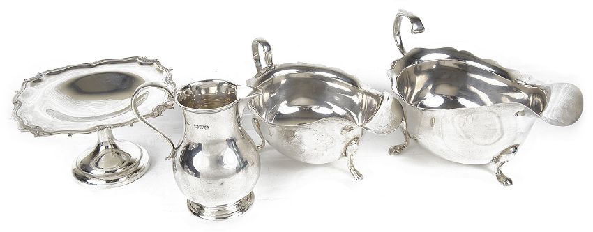 of typical form with c-scroll handle and pad supports, together with a George V silver sauceboat, hallmarked Sheffield 1935 by Viner's Ltd, an Edwardian silver pedestal tazza, hallmarked London 1905 by William Comyns & Sons Ltd, of small proportions and a Victorian silver cream jug, hallmarked 1899 by Stokes & Ireland Ltd, of small proportions, (4).