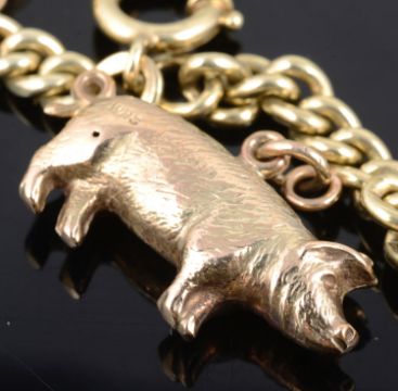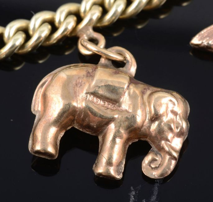 one Continental curb link chain marked .585 for 14ct gold and suspended with various mainly hollow rose gold 9ct charms including a piggy, a koala bear and. top hat, together with another curb link bracelet, tests for silver, suspended with a variety of mainly 9ct old charms including a thistle, a piggy and an elephant (2)