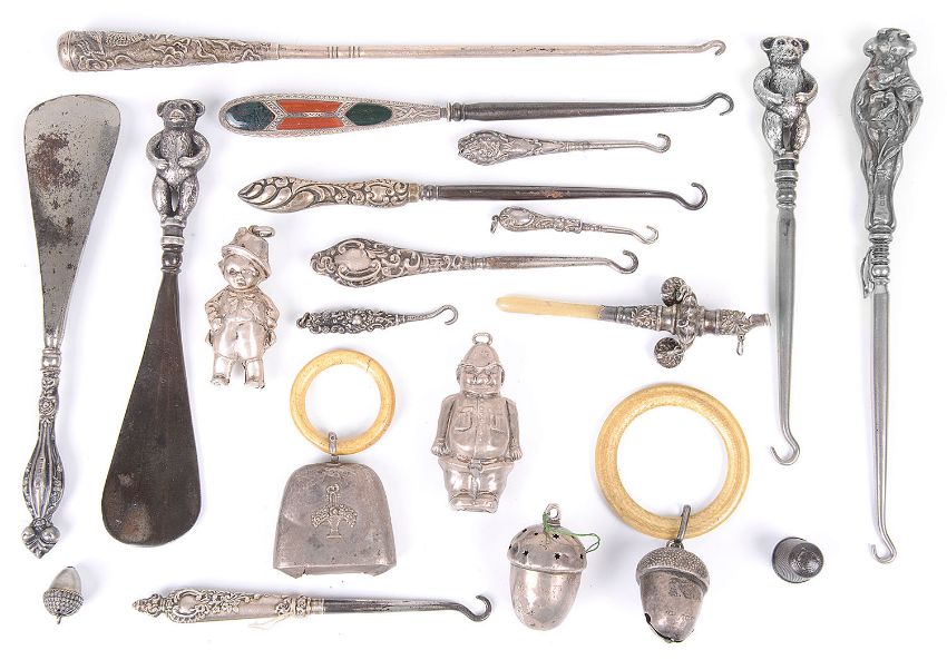 comprising a matching silver shoe horn and hook with handles in the form of teddy bears hallmarked Birmingham 1909, a Chinese handled button hook by Wang Hinge, six Edwardian silver handled hooks, a rattle in the form of a policeman, a rattle in the form of an acorn and four other rattles, and a silver cased thimble (qty)