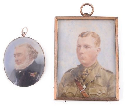 wearing a navy blue suit and a tie, watercolour on ivory, oval tests for gold glazed locket frame with suspension ring, together with an early 20th century portrait miniature of young man in army uniform, watercolour on ivory, rectangular, bears hand written paper label verso 'Title Thalatta! Thalatta!, gilt brass frame (2)