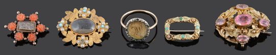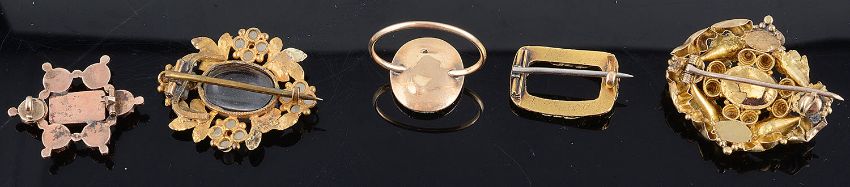 together with four other small Georgian brooches including a canetille work brooch a.f. tests for gold and a small Georgian painted locket ring, a.f., tests for gold (5)