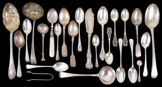 comprising a George III silver old English pattern table spoon, London, 1787 by Hester Bateman, a George III old English pattern sauce ladle, London, 1791 by William Sutton, a Victorian silver Queens pattern butter knife, London, 1864 by Charles Boyton, a Victorian christening spoon with reed stem and ancathus leaf cast decoration, London, 1874 by George Adams, an embossed berry table spoon, Sheffield, 1867 by Martin, Hall & Co., a Georgian sauce ladle later gilt, the bowl pieced and embossed, a set of six late Victorian teaspoons with bright cut engraved stems, a jam spoons with mother of pearl handle, a pair of sugar tongs and assorted teaspoons etc