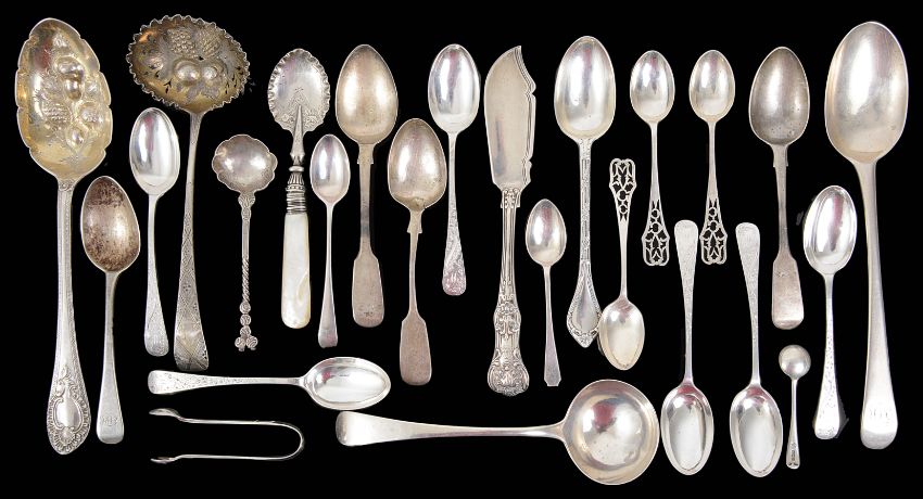 Condition: Bateman spoon thinning at tip of bowl, surface scratches and dings to bowl, gilding to both 'berried' spoons showing wear, assorted spoons some have damage, otherwise age commensurate condition