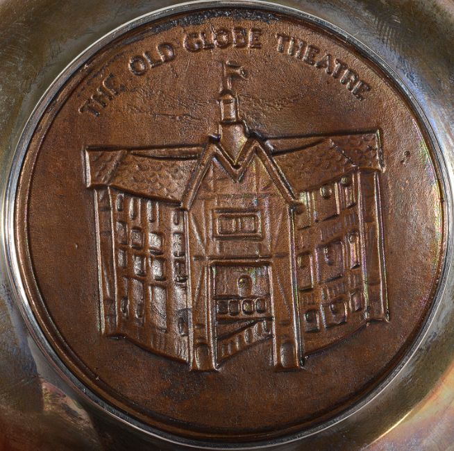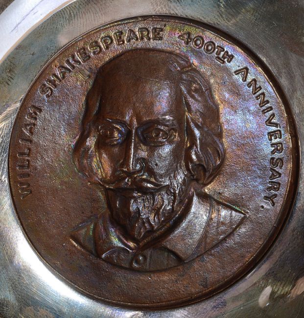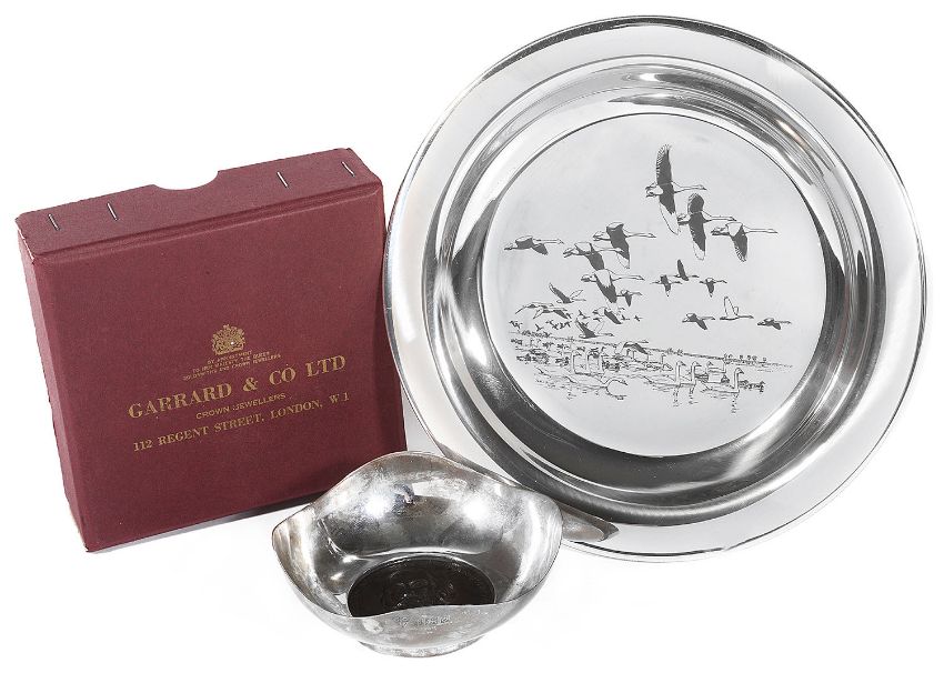 etched and heightened in black with wildfowl together with a contemporary silver William Shakespeare 400th anniversary dish inset with a bronze medallion, Birmingham, 1963 by Garrards, both in original boxes (2)