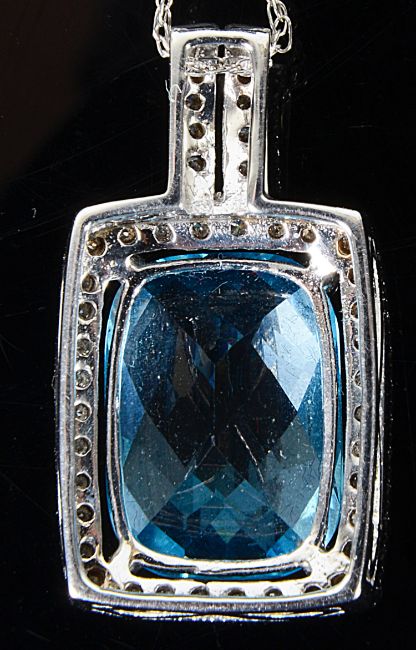 the rectangular cushion cut stone in a raised claw setting with a diamond set border on a diamond set suspension loop and delicate 14k oval multi-link chain
