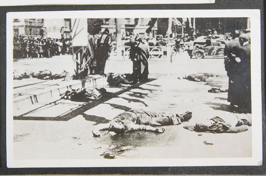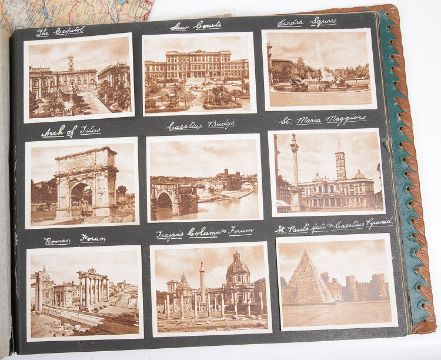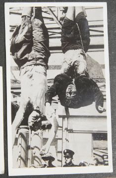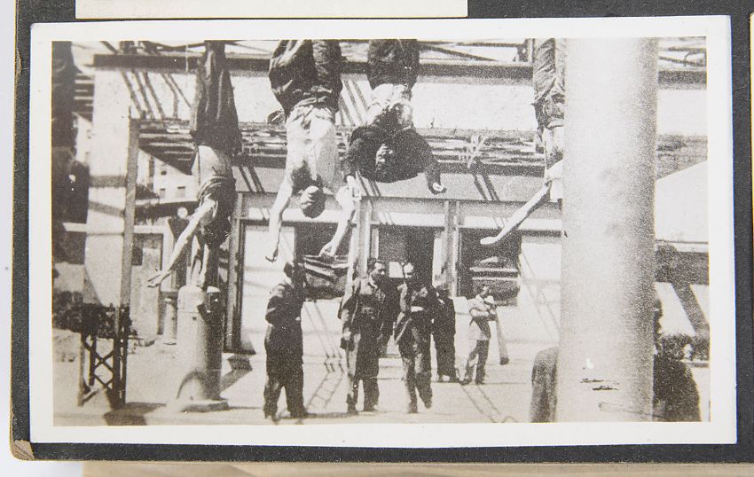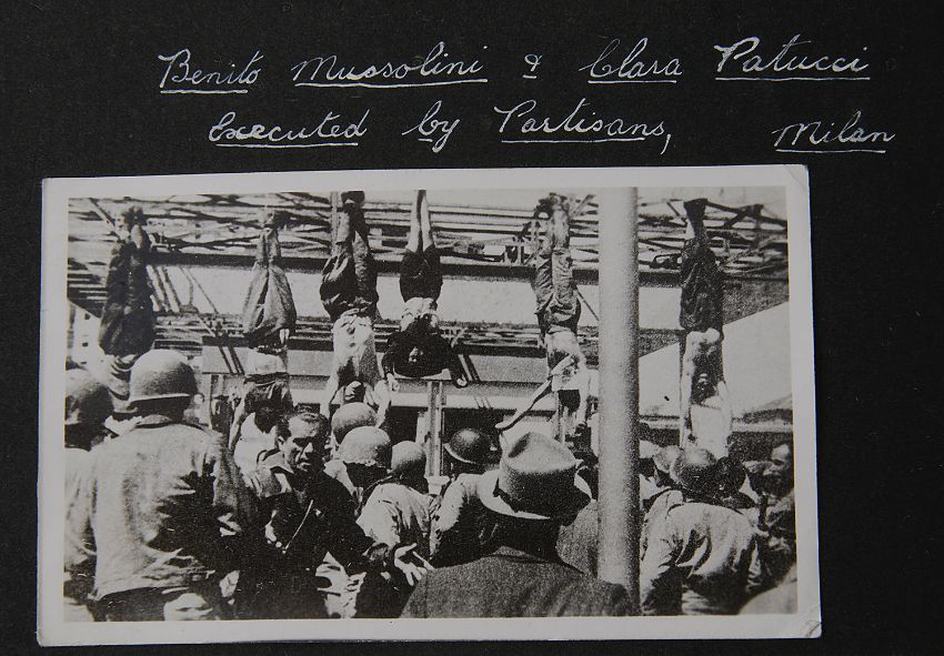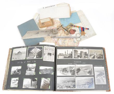 comprising, War Medal, Defence Medal, 1939-1945 Star, Italy Star, on original ribbons, ribbon bar, Navigator's, Air Bomber's and Air Gunner's Flying Log Book (Oct 1944-Aug, 1945: Oct 1944 Unit 76, O.T.U., Aqir, Palestine, Jan 1945 Unit 1675 H.C.U., Abu-Sueir, Egypt, Feb-Oct 1945 Unit 34 SQON S.A.A.F., Foggia Italy), leather bound photograph album mirroring log book including, aerial bomber shots, eyewitness photographs of the executed bodies of Benito Mussolini & Clara Petacci, executed by partisans, Milan 28th April, 1945, other items to include, RAF Service and Release book pair of dog tags, cloth badges, RAF SOE Blood Chit-Russian Type 2, a map printed on silk of Holland, France and Germany printed folding maps of Roma-Sarejevo and Venezia, a brass buckle, surgeons steel amputation saw and a pair of steel forceps (qty)