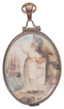 standing with her arm raised and pointing to the sea, her other arm rested on a plinth, in the background a man o war under sail, watercolour on ivory, oval, gilt metal glazed double locket