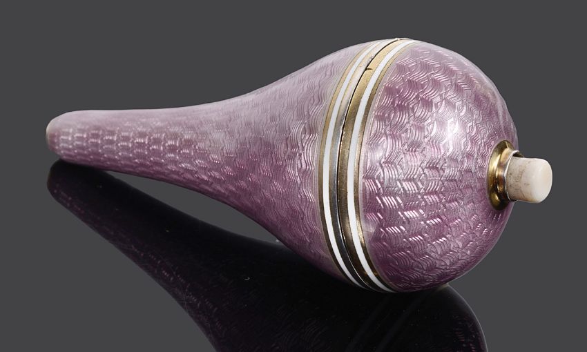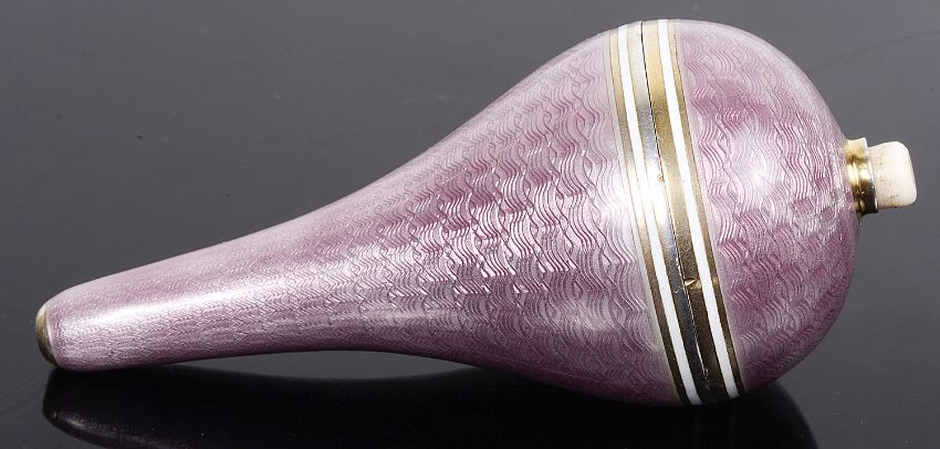 of elongated baluster form, pink ground enamel with white banded borders, ivory push button