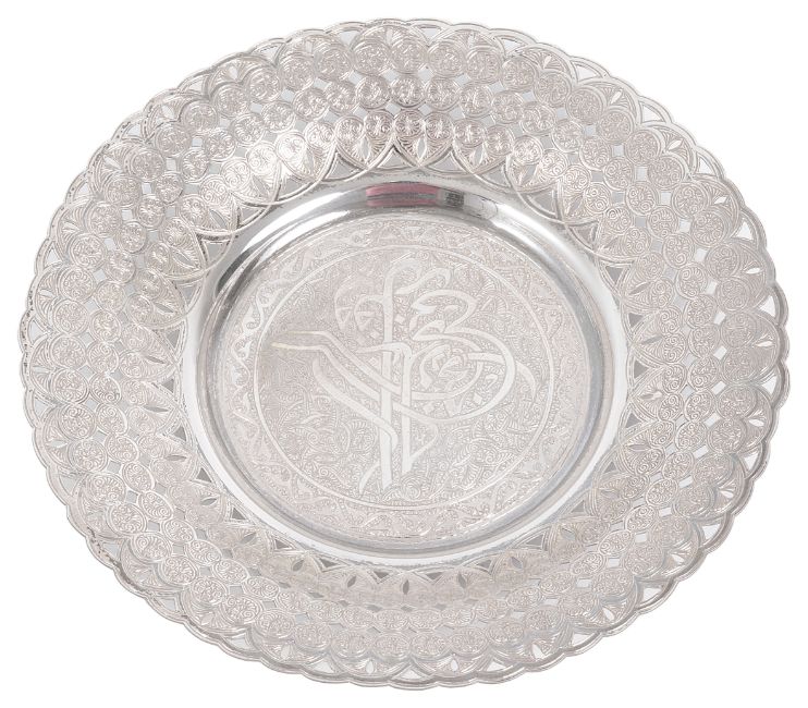 of circular design, with raised pierced sides and scalloped edged rim, all over foliate engraved decoration, Arabic characters to centre