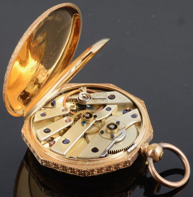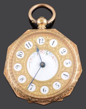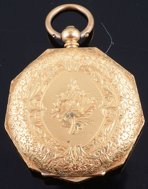 foliate engraved gold dial with black arabic numerals in white enamel apertures, lever movement, octagonal case all over foliate engraved, case numbered 29108