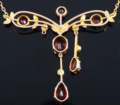 A delicate Edwardian garnet and seed pearl set scroll necklace