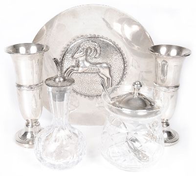 comprising a .830 zodiac dish, possibly Mexican, of circular form, embossed to centre with Aries, together with a pair of loaded specimen vases, Birmingham, 1971 by Poston Products Ltd, a cut glass jam pot with domed silver lid and Albany pattern jam spoon and a Webb crystal oil bottle with silver fitting (6)
