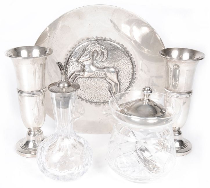 zodiac dish - diameter 18 cm., vases - height. 25.8 cm, weighable silver approx. 6.58ozt