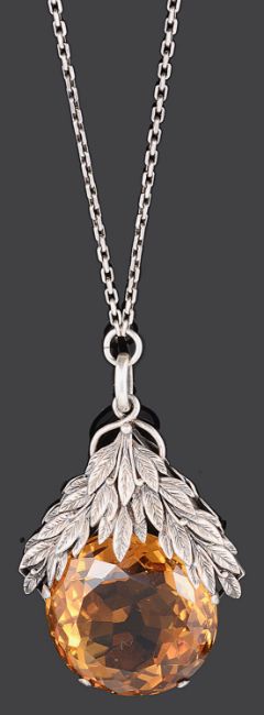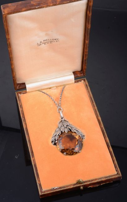 formed as a large circular citrine held within a layered foliate cluster pendant mount, foliate detail to reverse, suspended from a white metal chain, tests for silver, the pendant in fitted jewel box from L.S. Mallory, 145 Fenchurch St., E.C.3