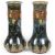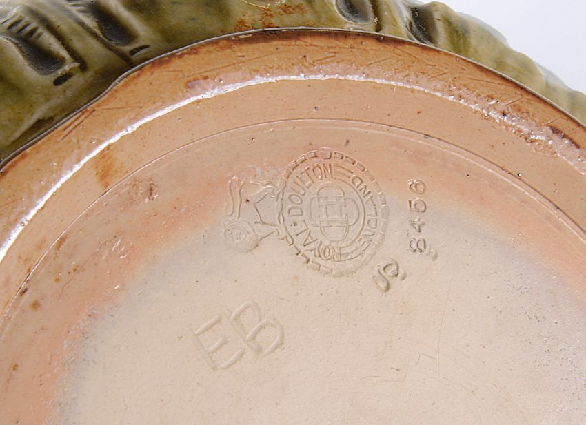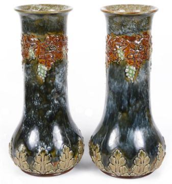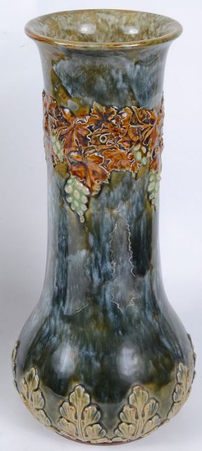 of bulbous cylinder form, mottled blue green ground, relief moulded with a band of fruiting vine leaves, stiff leaf band to base, incised E B for Ethel Beard, 8456, factory impressed mark (2)