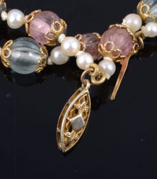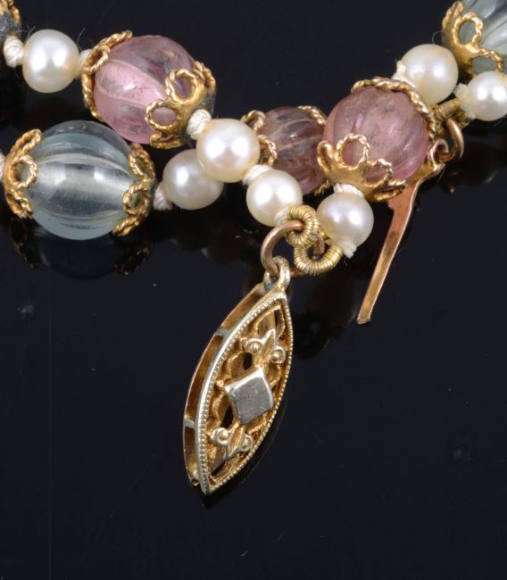 the beads alternating in colour and spaced with single river pearls, the tourmaline beads with yellow metal collars, test for gold and graduating to either end with 9ct gold filigree clasp