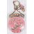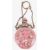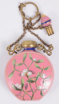 the flask of rounded form, pink ground and decorated in bright colour enamel with spray of mistletoe to both sides within white gilt dot borders, having a gilt blue band to the side, the mount with twin scroll fitting suspended on a gilt metal chain with finger ring, stopper also with chain