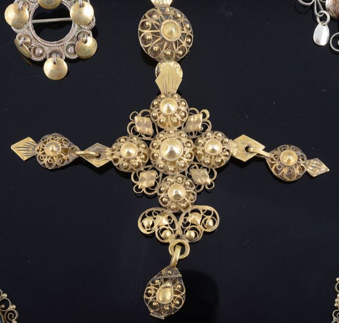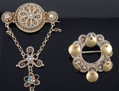 including a large 19th Century Norwegian solje pendant cross, tests silver gilt, two more silver solje brooches, a lapis lazuli silver gilt filigree necklace and another filigree pendant necklace, tests silver and other items (qty)