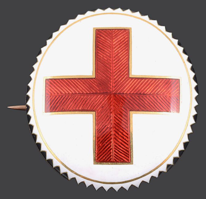 the oval brooch testing for gold and having central red guilloche enamel cross on a plain white enamel ground and with black scolloped edge and gold edge detail