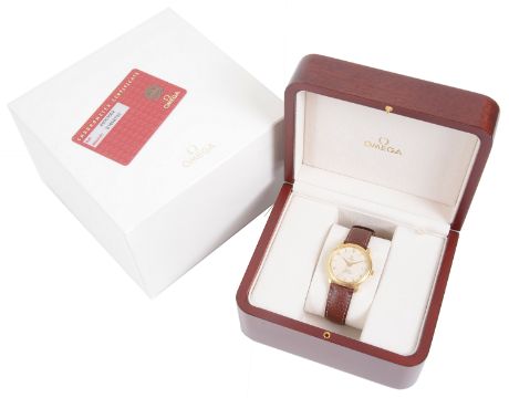 with baton and arabic numerals, champagne coloured dial with sweep seconds, with a brown leather strap in original fitted leather case with original purchase receipt, outer white card case, Omega chronometer certificate and tag, watch ref 81058752